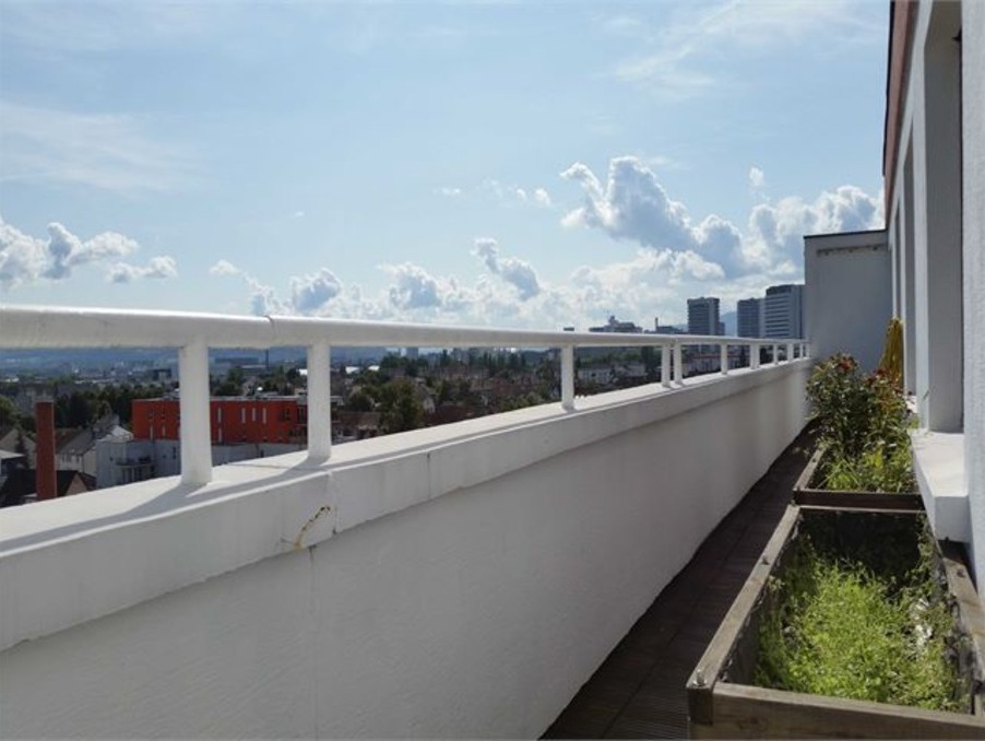 Sur l'Avenue de Bâle, au 7e et dernier étage en attique, très bel appartement F4/5 de 101, 56m² comprenant une entrée avec placards de rangement, une cuisine équipée (avec évier double, plaque vitrocéramique, réfrigérateur avec congélateur, hotte, four, lave-vaisselle, rangements) et ouverte sur un spacieux salon/séjour double, avec accès sur une double terrasse de 17m² et 23m² (exposées Sud-Est et Sud-Ouest) sans aucun vis-à-vis et dont une couverte et avec store, un cellier/buanderie avec emplacements machines, rangements et lavabo, 3 chambres à coucher, une salle d'eau avec douche et double vasque, et un WC séparé avec lave-main.