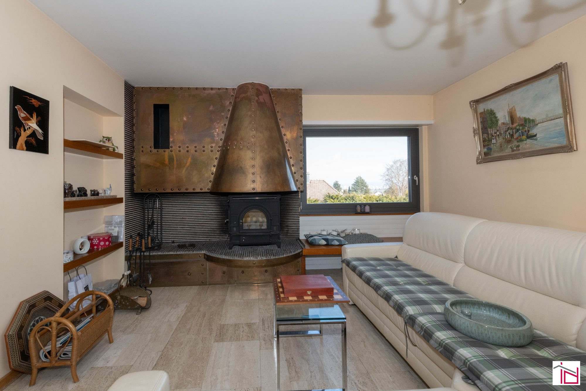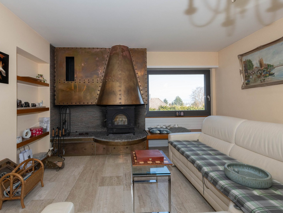 Séjour lumineux de 48 m² avec poêle canadien et larges baies vitrées ouvrant sur une terrasse couverte exposée sud